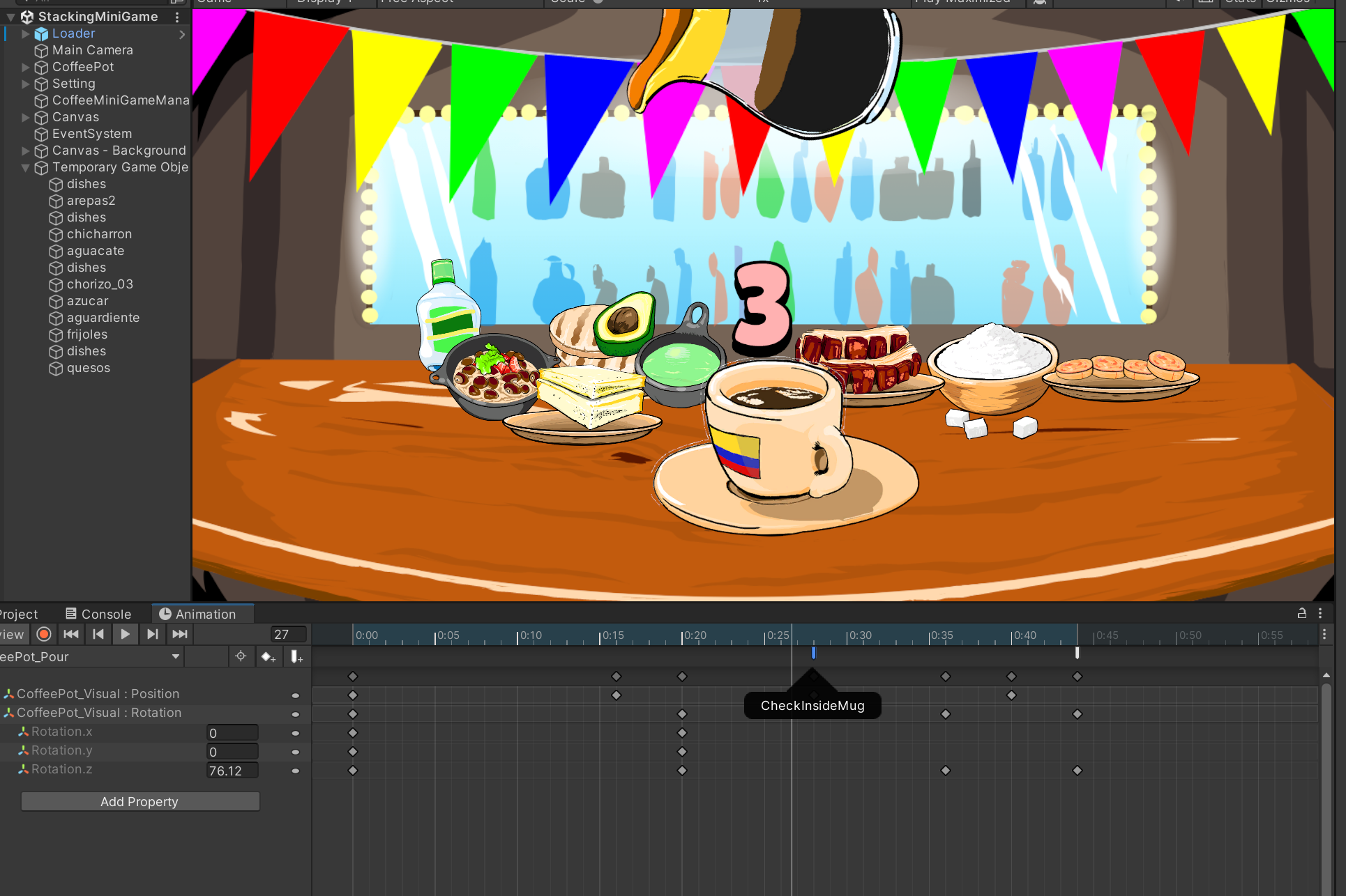 Handling the movement of the Pot. The left and right bounds of the pot's movements change based on the resolution of the device used to play the game. The detection of successful pours uses the x position of the spout of the pour animation and compares it with a range of acceptable values (the bounds of the mug) and spawns a particle system on successful pours. The controller uses events to handle the many moving parts without introducing coupling.
