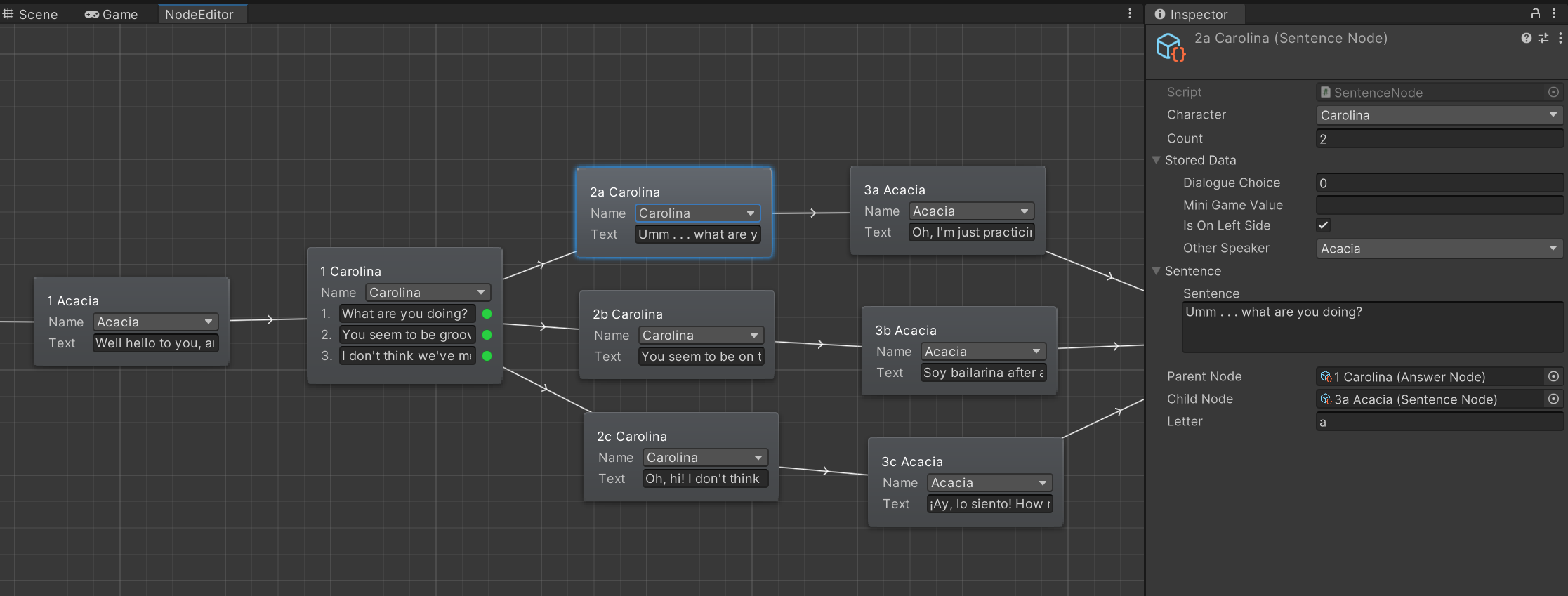Designed and implemented the dialogue maneuvering. Each node dictates a specific point of dialogue and holds information that will change the state of the game, such as which character is talking, if they're on the right or left side, and if they need to pass data along the dialogue which can change the course of the story. Created two kinds of nodes: Sentence Nodes and Answer Nodes.